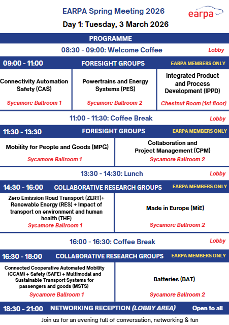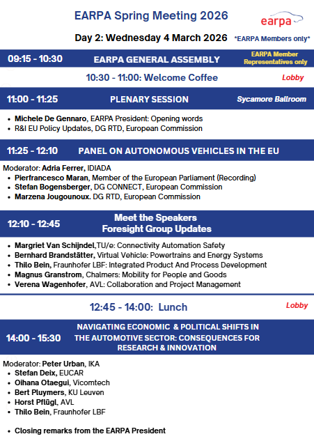 - Get insights into topics such as updates on R&I EU policy updates, automotive joint undertaking, autonomous vehicles and more at the Plenary Session on 4 March 2026 (EARPA Members Only).